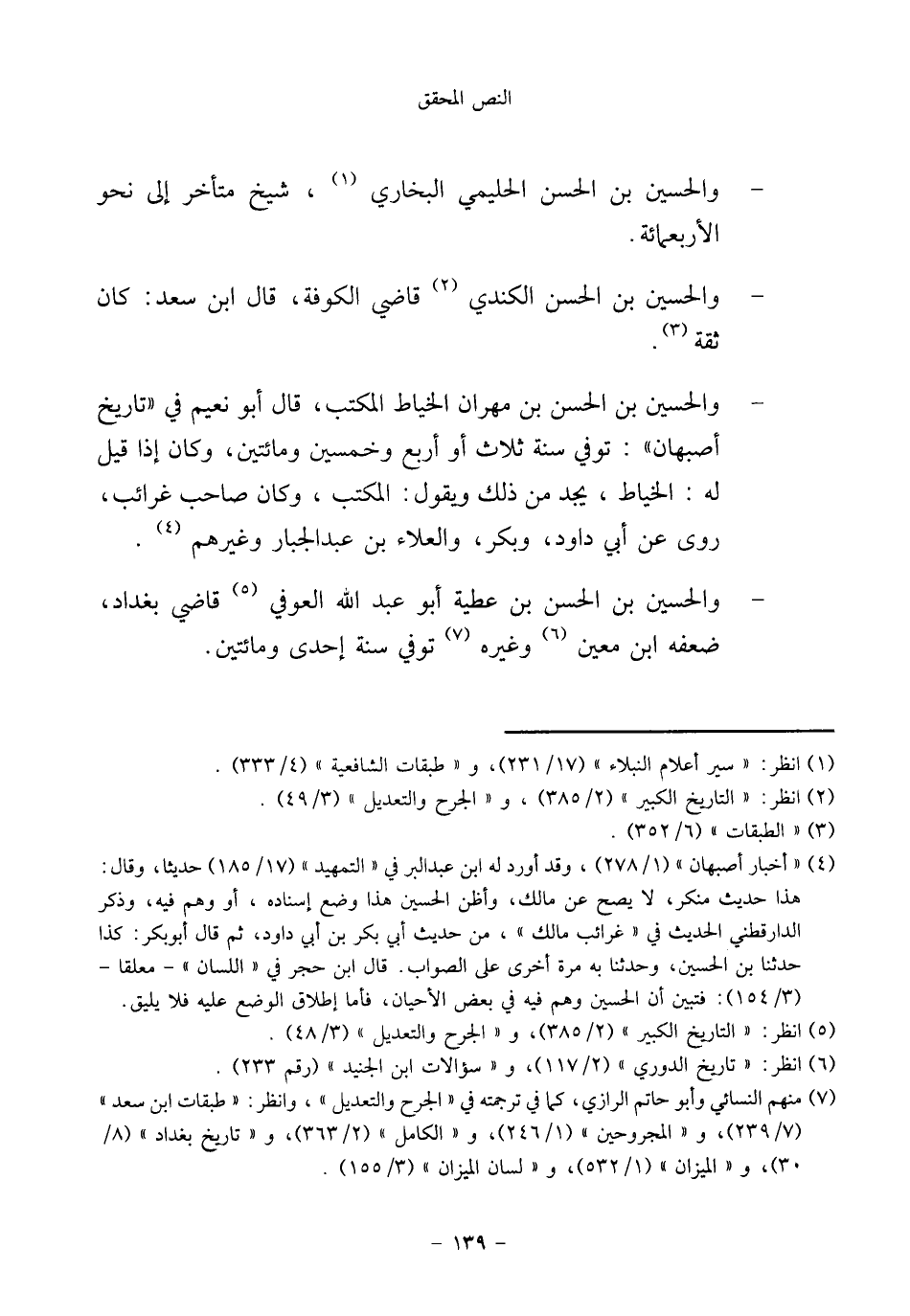(¬٤) "أخبار أصبهان" (١/ ٢٧٨)، وقد أورد له ابن عبد البر في "التمهيد" (١٧/ ١٨٥) حديثا، وقال: هذا حديث منكر، لا يصح عن مالك، وأظن الحسين هذا وضع إسناده، أو وهم فيه، وذكر الدارقطني الحديث في "غرائب مالك"، من حديث أبي بكر بن أبي داود، ثم قال أبو بكر: كذا حدثنا بن الحسين، وحدثنا به مرة أخرى على الصواب. قال ابن حجر في "اللسان" -معلقا- (٣/ ١٥٤): فتبين أن الحسين وهم فيه في بعض الأحيان، فأما إطلاق الوضع عليه فلا يليق.
