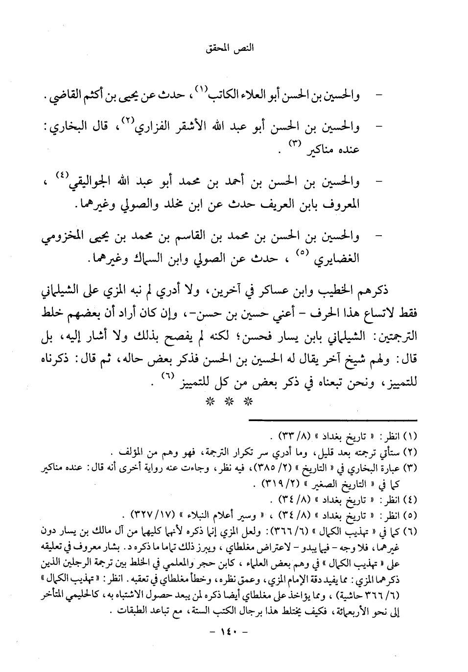 ذكرهم الخطيب وابن عساكر في آخرين، ولا أدري لم نبه المزي على الشيلماني فقط لاتساع هذا الحرف -أعني حسين بن حسن-، وإن كان أراد أن بعضهم خلط الترجمتين: الشيلماني بابن يسار فحسن؛ لكنه لم يفصح بذلك ولا أشار إليه، بل قال: ولهم شيخ آخر يقال له الحسين بن الحسن فذكر بعض حاله، ثم قال: ذكرناه للتمييز، ونحن تبعناه في ذكر بعض من كل للتمييز (¬٦).