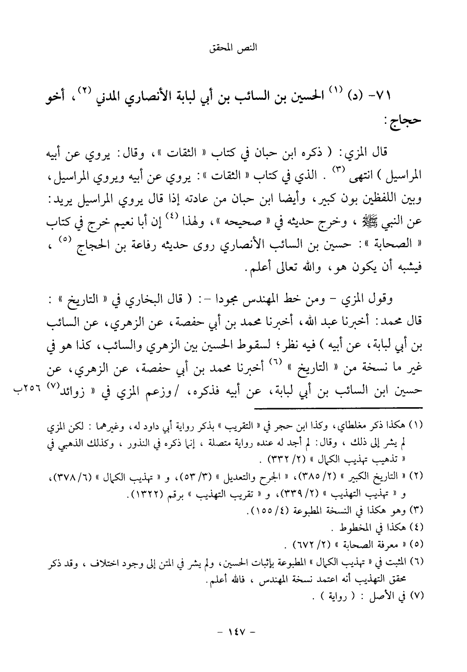 (¬٦) المثبت في "تهذيب الكمال" المطبوعة بإثبات الحسين، ولم يشر في المتن إلى وجود اختلاف، وقد ذكر محقق التهذيب أنه اعتمد نسخة المهندس، فالله أعلم.