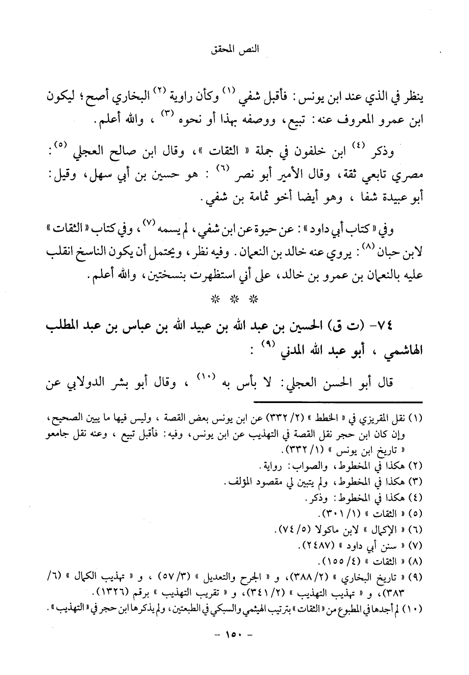وذكر (¬٤) ابن خلفون في جملة "الثقات"، وقال ابن صالح العجلي (¬٥): مصري تابعي ثقة، وقال الأمير أبو نصر (¬٦): هو حسين بن أبي سهل، وقيل: أبو عبيدة شفا، وهو أيضا أخو ثمامة بن شفي.