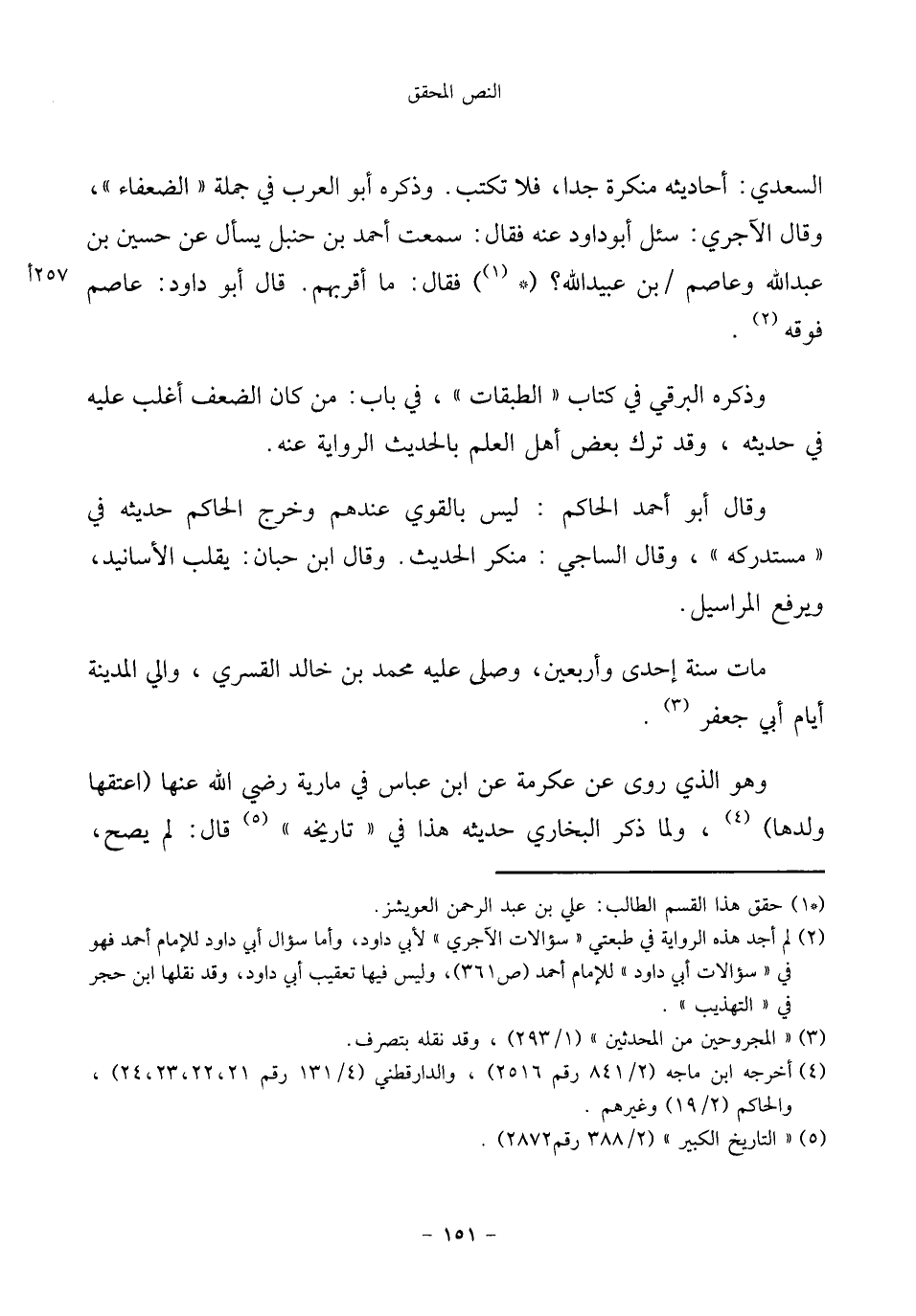(¬٢) لم أجد هذه الرواية في طبعتي "سؤالات الآجري" لأبي داود، وأما سؤال أبي داود للإمام أحمد فهو في "سؤالات أبي داود" للإمام أحمد (ص ٣٦١)، وليس فيها تعقيب أبي داود، وقد نقلها ابن حجر في "التهذيب".