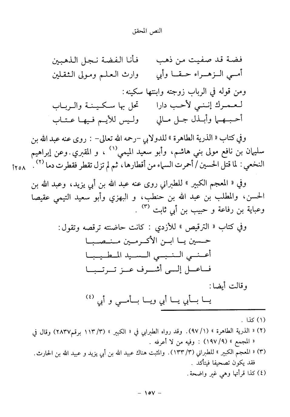 وفي كتاب "الذرية الطاهرة" للدولابي -رحمه الله تعالى-: روى عنه عبد الله بن سليمان بن نافع مولى بني هاشم، وأبو سعيد الميمي (¬١)، والمقبري. وعن إبراهيم النخعي: لما قتل الحسين أحمرت السماء من أقطارها، ثم لم تزل تقطر فقطرت دما (¬٢).