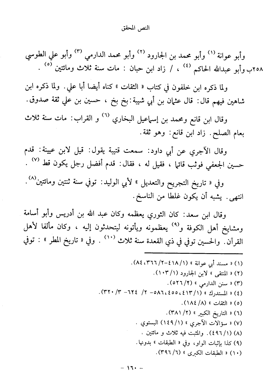 ولما ذكره ابن خلفون في كتاب "الثقات" كناه أيضا أبا علي. ولما ذكره ابن شاهين فيهم قال: قال عثمان بن أبي شيبة: بخ بخ، حسين بن علي ثقة صدوق.