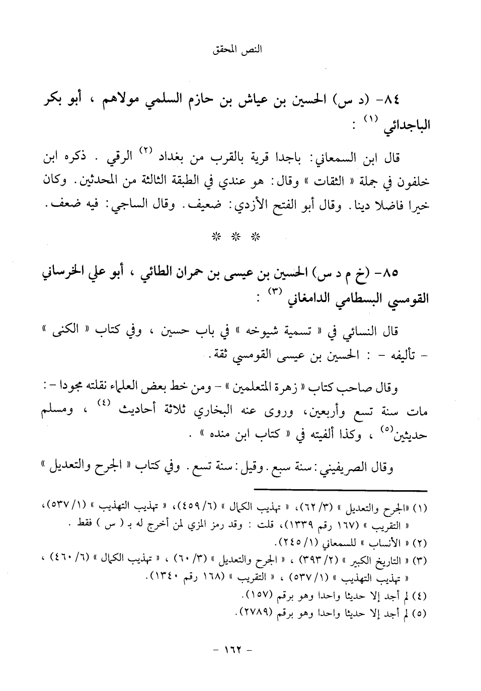 ٨٥ - (خ م د س) الحسين بن عيسى بن حمران الطائي، أبو علي الخرساني القومسي البسطامي الدامغاني (¬٣):