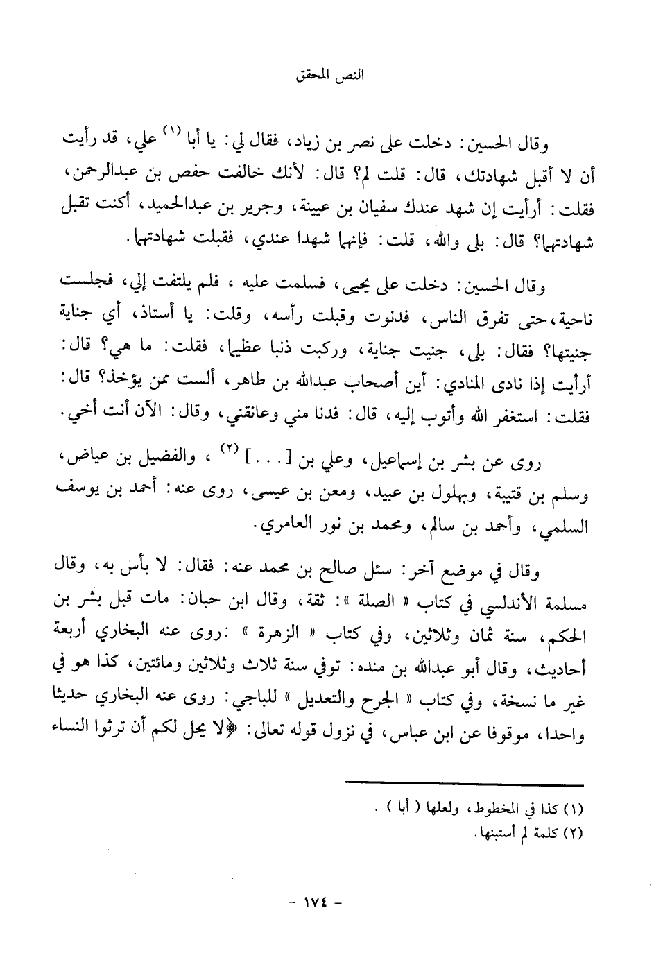 وقال في موضع آخر: سئل صالح بن محمد عنه: فقال: لا بأس به، وقال مسلمة الأندلسي في كتاب "الصلة": ثقة، وقال ابن حبان: مات قبل بشر بن الحكم، سنة ثمان وثلاثين، وفي كتاب "الزهرة": روى عنه البخاري أربعة أحاديث، وقال أبو عبد الله بن منده: توفي سنة ثلاث وثلاثين ومائتين، كذا هو في غير ما نسخة، وفي كتاب "الجرح والتعديل" للباجي: روى عنه البخاري حديثا واحدا، موقوفا عن ابن عباس، في نزول قوله تعالى: {لَا يَحِلُّ لَكُمْ أَنْ تَرِثُوا النِّسَاءَ