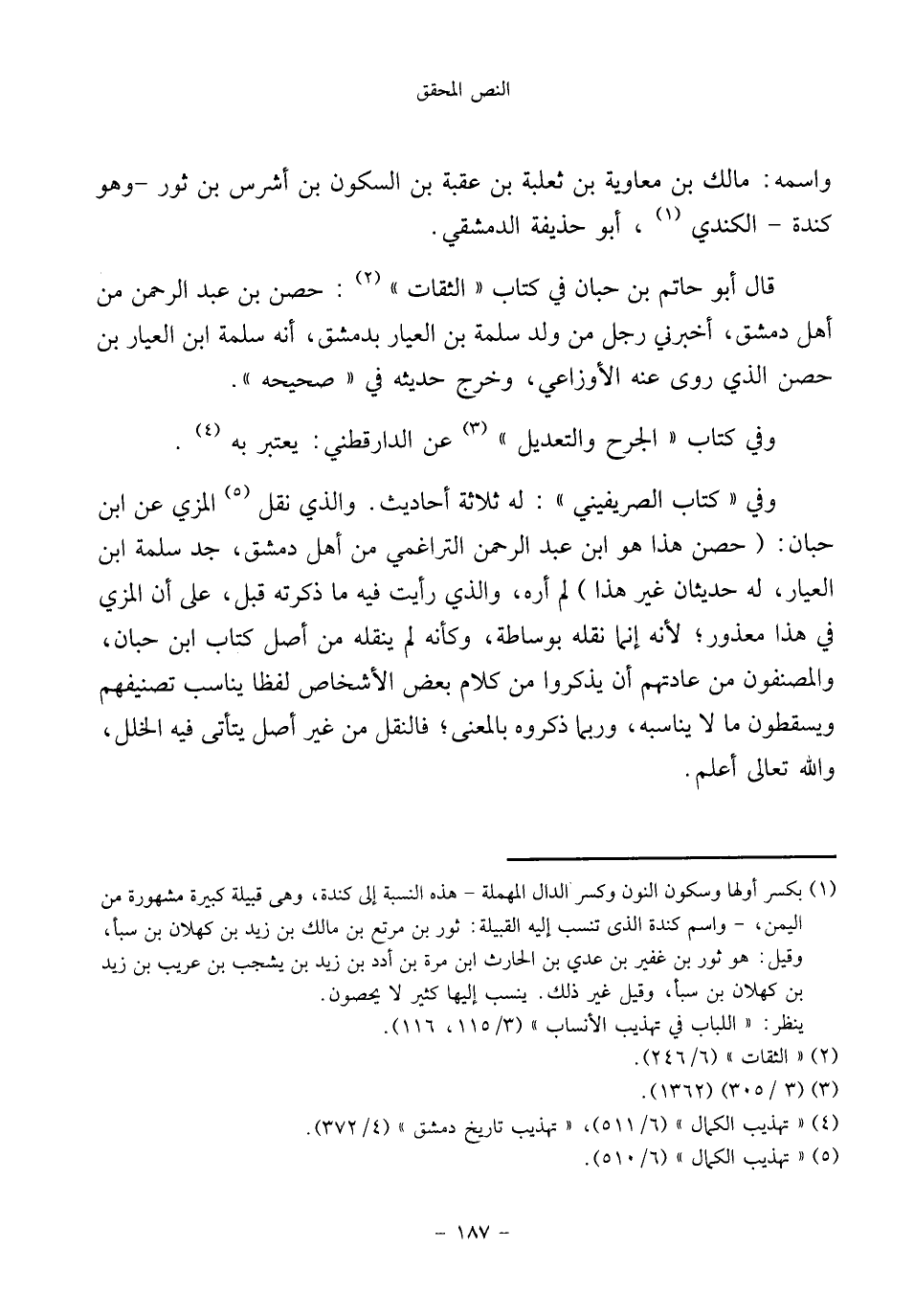 وفي "كتاب الصريفيني": له ثلاثة أحاديث. والذي نقل (¬٥) المزي عن ابن حبان: (حصن هذا هو ابن عبد الرحمن التراغمي من أهل دمشق، جد سلمة ابن العيار، له حديثان غير هذا) لم أره، والذي رأيت فيه ما ذكرته قبل، على أن المزي في هذا معذور؛ لأنه إنما نقله بوساطة، وكأنه لم ينقله من أصل كتاب ابن حبان، والمصنفون من عادتهم أن يذكروا من كلام بعض الأشخاص لفظا يناسب تصنيفهم ويسقطون ما لا يناسبه، وربما ذكروه بالمعنى؛ فالنقل من غير أصل يتأتى فيه الخلل، والله تعالى أعلم.