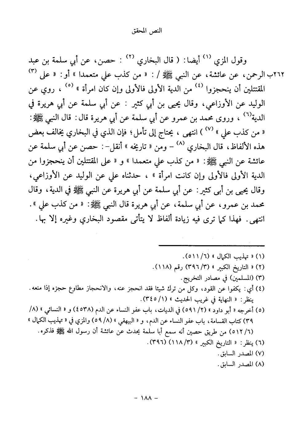 وقول المزي (¬١) أيضا: (قال البخاري (¬٢): حصن، عن أبي سلمة بن عبد الرحمن، عن عائشة، عن النبي - صَلَّى اللهُ عَلَيْهِ وَسَلَّمَ -: "من كذب علي متعمدا" أو: "على (¬٣) المقتتلين أن ينحجزوا (¬٤) من الدية الأولى فالأولى وإن كان امرأة" (¬٥)، روي عن الوليد عن الأوزاعي، وقال يحيى بن أبي كثير: عن أبي سلمة عن أبي هريرة في الدية (¬٦)، وروى محمد بن عمرو عن أبي سلمة عن أبي هريرة قال: قال النبي - صَلَّى اللهُ عَلَيْهِ وَسَلَّمَ -: "من كذب علي" (¬٧)) انتهى، يحتاج إلى تأمل؛ فإن الذي في البخاري يخالف بعض هذه الألفاظ، قال البخاري (¬٨) -ومن "تاريخه " أنقل-: حصن عن أبي سلمة عن عائشة عن النبي - صَلَّى اللهُ عَلَيْهِ وَسَلَّمَ -: "من كذب علي متعمدا" و"على المقتتلين أن ينحجزوا من الدية الأولى فالأولى وإن كانت امرأة"، حدثناه علي عن الوليد عن الأوزاعي، وقال يحيى بن أبى كثير: عن أبي سلمة عن أبي هريرة عن النبي - صَلَّى اللهُ عَلَيْهِ وَسَلَّمَ - في الدية، وقال محمد بن عمرو، عن أبي سلمة، عن أبي هريرة قال النبي - صَلَّى اللهُ عَلَيْهِ وَسَلَّمَ -: "من كذب علي". انتهى. فهذا كما ترى فيه زيادة ألفاظ لا يتأتى مقصود البخاري وغيره إلا بها.