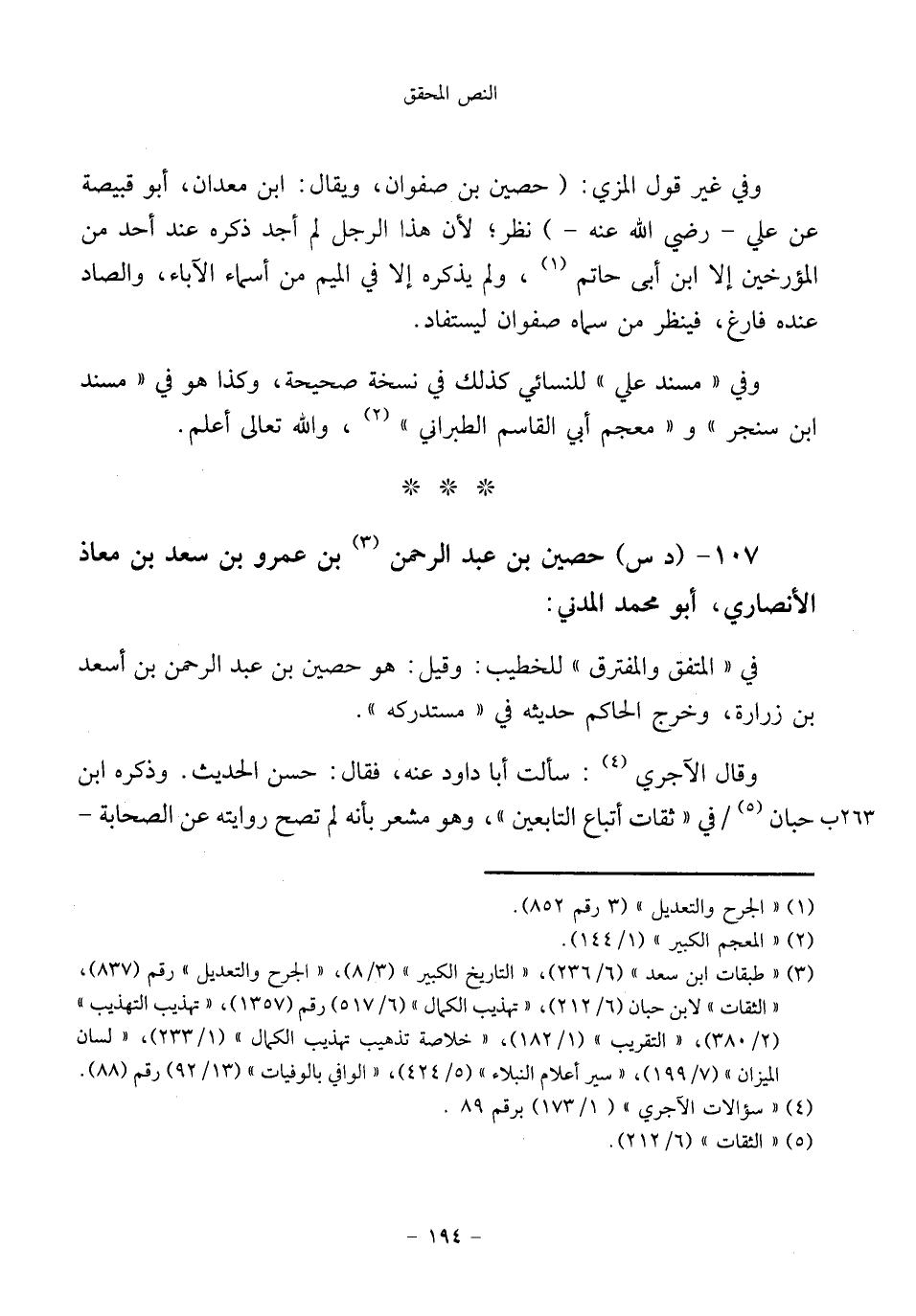 وفي غير قول المزي: (حصين بن صفوان، ويقال: ابن معدان، أبو قبيصة عن علي -رضي الله عنه-) نظر؛ لأن هذا الرجل لم أجد ذكره عند أحد من المؤرخين إلا ابن أبى حاتم (¬١)، ولم يذكره إلا في الميم من أسماء الآباء، والصاد عنده فارغ، فينظر من سماه صفوان ليستفاد.