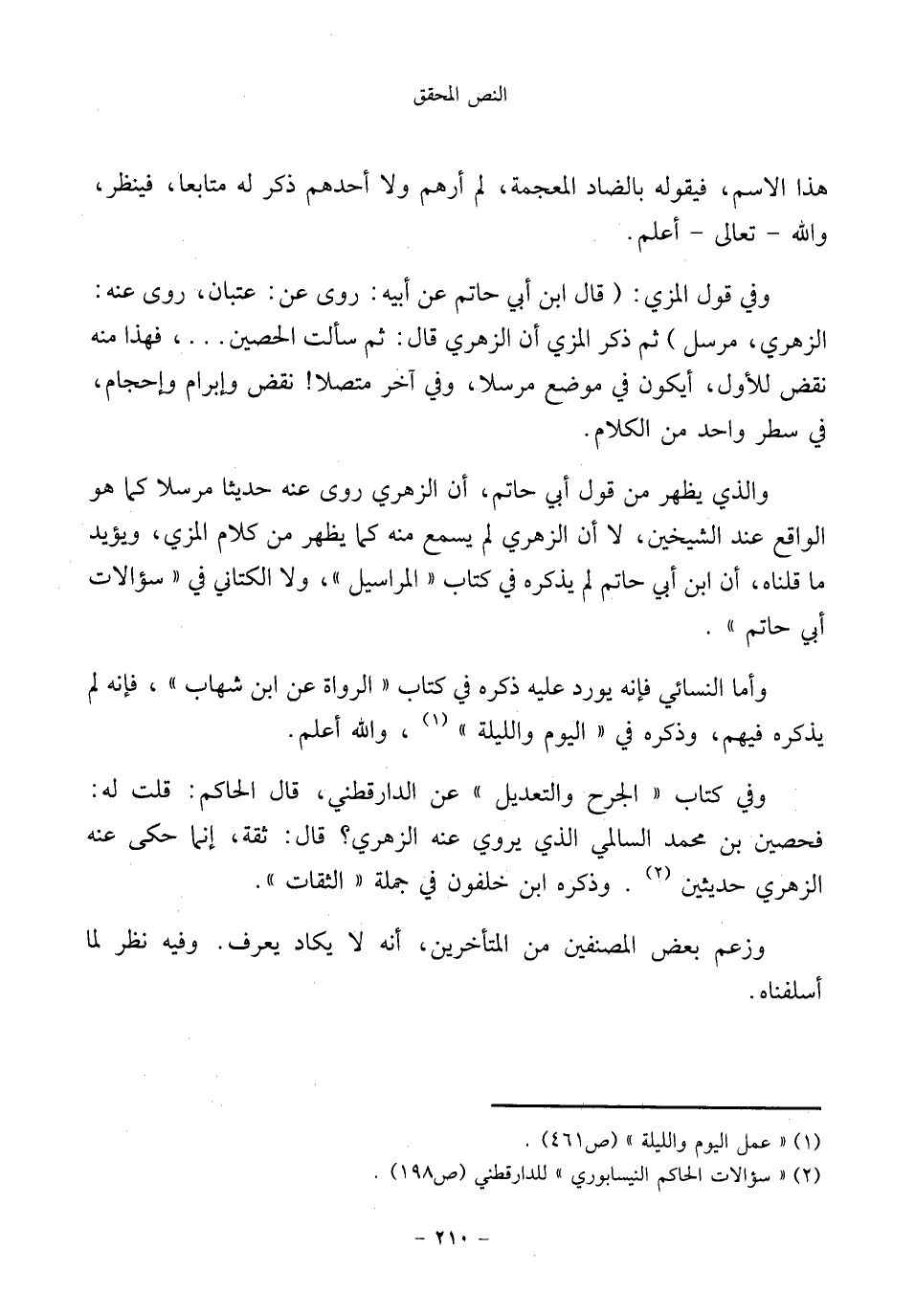 وفي قول المزي: (قال ابن أبي حاتم عن أبيه: روى عن: عتبان، روى عنه: الزهري، مرسل) ثم ذكر المزي أن الزهري قال: ثم سألت الحصين ... ، فهذا منه نقض للأول، أيكون في موضع مرسلا، وفي آخر متصلا! نقض وإبرام وإحجام، في سطر واحد من الكلام.