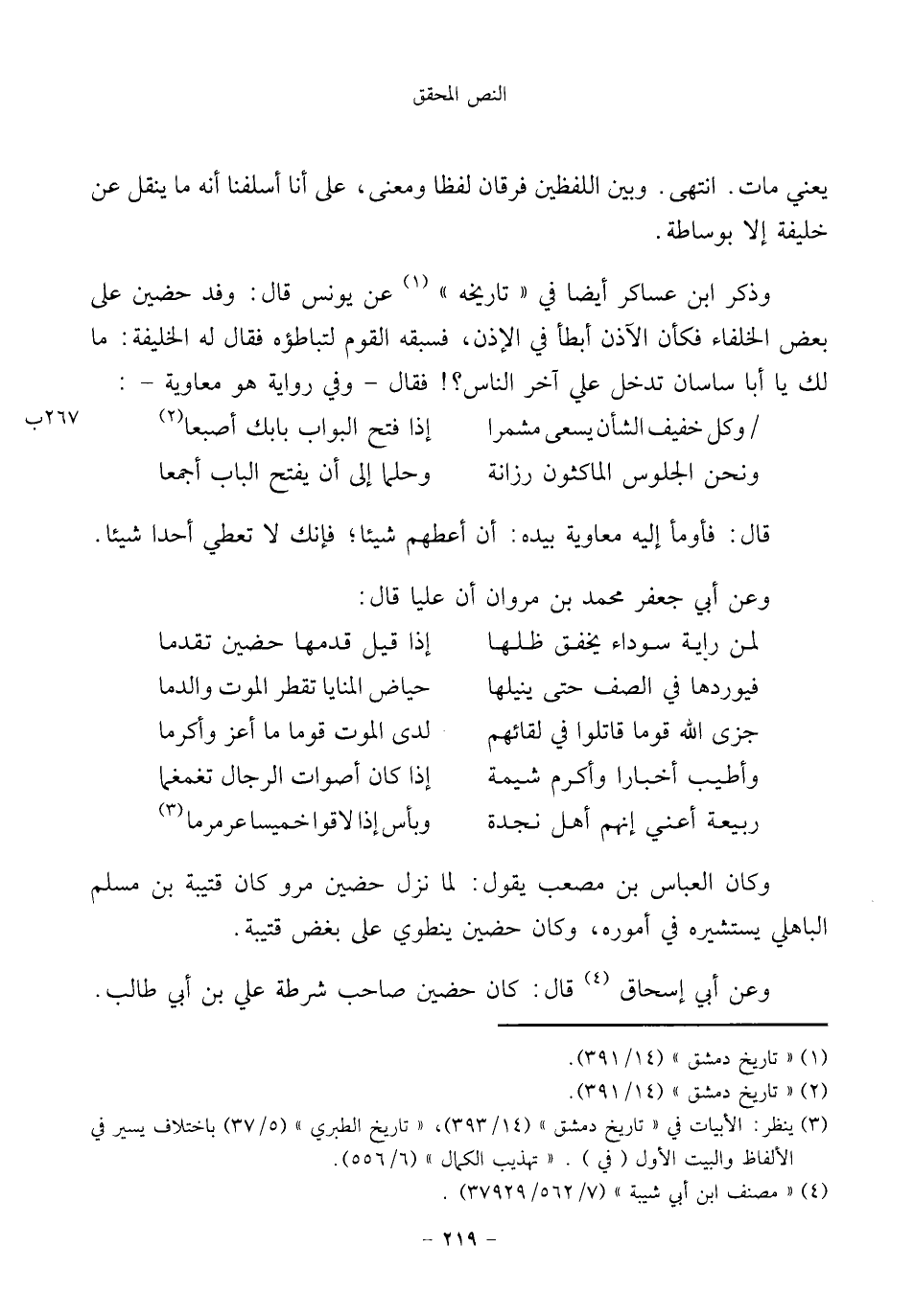 (¬٣) ينظر: الأبيات في "تاريخ دمشق" (١٤/ ٣٩٣)، "تاريخ الطبري" (٥/ ٣٧) باختلاف يسير في الألفاظ والبيت الأول (في). "تهذيب الكمال" (٦/ ٥٥٦).