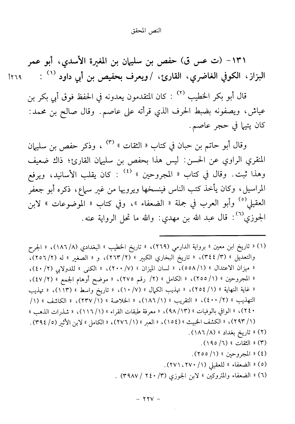 ١٣١ - (ت عس ق) حفص بن سليمان بن المغيرة الأسدي، أبو عمر البزاز، الكوفي الغاضري، القارئ، ويعرف بحفيص بن أبي داود (¬١):