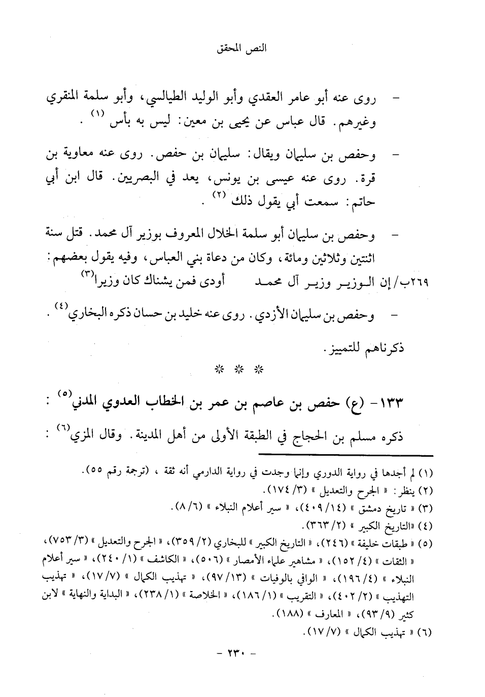 (¬٥) "طبقات خليفة" (٢٤٦)، "التاريخ الكبير" للبخاري (٢/ ٣٥٩)، "الجرح والتعديل" (٣/ ٧٥٣)، "الثقات" (٤/ ١٥٢)، "مشاهير علماء الأمصار" (٥٠٦)، "الكاشف" (١/ ٢٤٠)، "سير أعلام النبلاء" (٤/ ١٩٦)، "الوافي بالوفيات" (١٣/ ٩٧)، "تهذيب الكمال" (٧/ ١٧)، "تهذيب التهذيب" (٢/ ٤٠٢)، "التقريب" (١/ ١٨٦)، "الخلاصة" (١/ ٢٣٨)، "البداية والنهاية" لابن كثير (٩/ ٩٣)، "المعارف" (١٨٨).