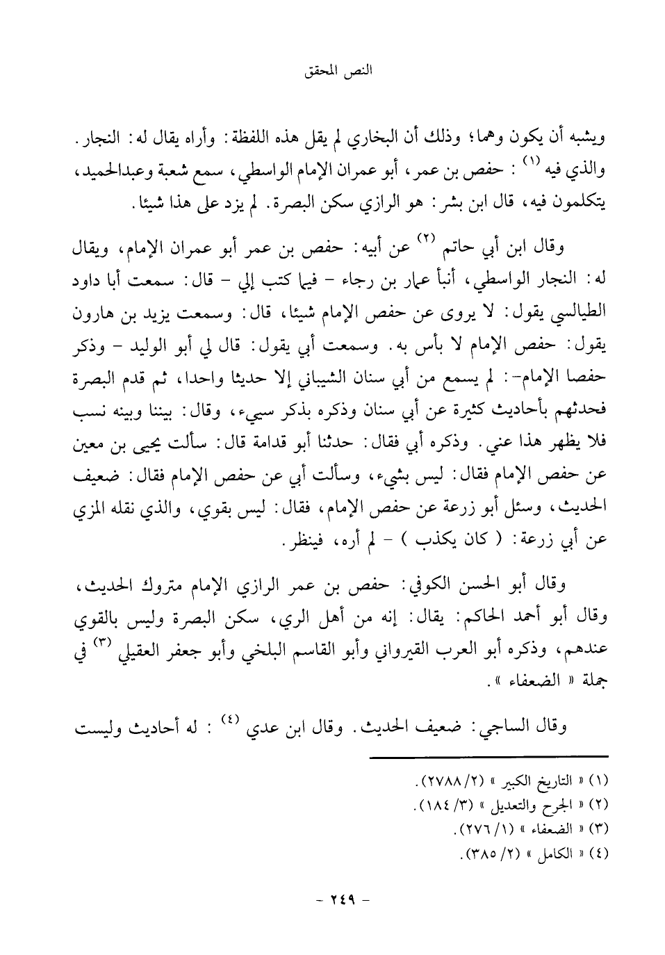 وقال أبو الحسن الكوفي: حفص بن عمر الرازي الإمام متروك الحديث، وقال أبو أحمد الحاكم: يقال: إنه من أهل الري، سكن البصرة وليس بالقوي عندهم، وذكره أبو العرب القيرواني وأبو القاسم البلخي وأبو جعفر العقيلي (¬٣) في جملة "الضعفاء".