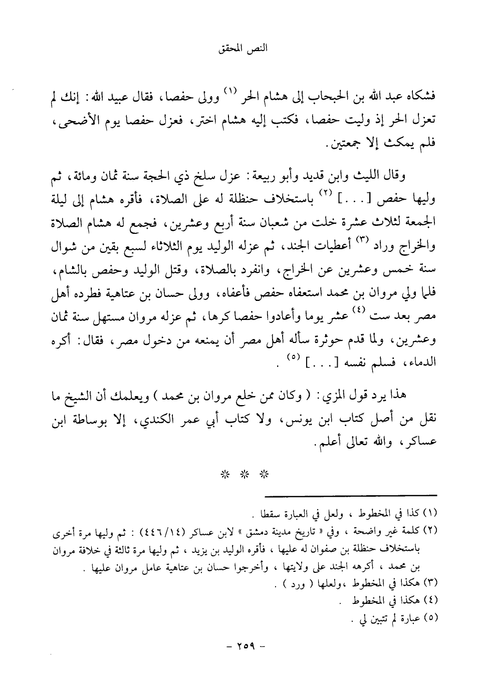 (¬٢) كلمة غير واضحة، وفي "تاريخ مدينة دمشق" لابن عساكر (١٤/ ٤٤٦): ثم وليها مرة أخرى باستخلاف حنظلة بن صفوان له عليها، فأقره الوليد بن يزيد، ثم وليها مرة ثالثة في خلافة مروان بن محمد، أكرهه الجند على ولايتها، وأخرجوا حسان بن عتاهية عامل مروان عليها.
