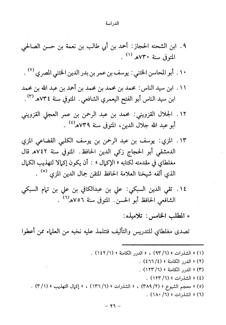 ١٣. المزي: يوسف بن عبد الرحمن بن يوسف الكلبي القضاعي المزي الدمشقي أبو الحجاج زكي الدين الحافظ. المتوفي سنة ٧٤٢ هـ قال مغلطاي في مقدمته لكتابه "الإكمال": أن يكون إكمالا لتهذيب الكمال الذي ألفه شيخنا العلامة الحافظ المتقن جمال الدين المزي (¬٥).