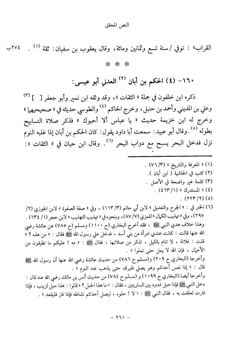 ذكره ابن خلفون في جملة "الثقات"، وقد وثقه ابن نمير وأبو جعفر [] (¬٣) وعلي بن المديني وأحمد بن حنبل، وخرج الحاكم (¬٤) والطوسي حديثه في "صحيحيهما" وخرج له ابن خزيمة حديث "يا عباس ألا أحبوك" فذكر صلاة التسابيح بطوله (¬٥). وقال أبو عبيد: سمعت أبا داود يقول: كان الحكم بن أبان إذا غلبه النوم نزل فدخل البحر يسبح مع دواب البحر (¬٦). وقال ابن حبان في "الثقات":