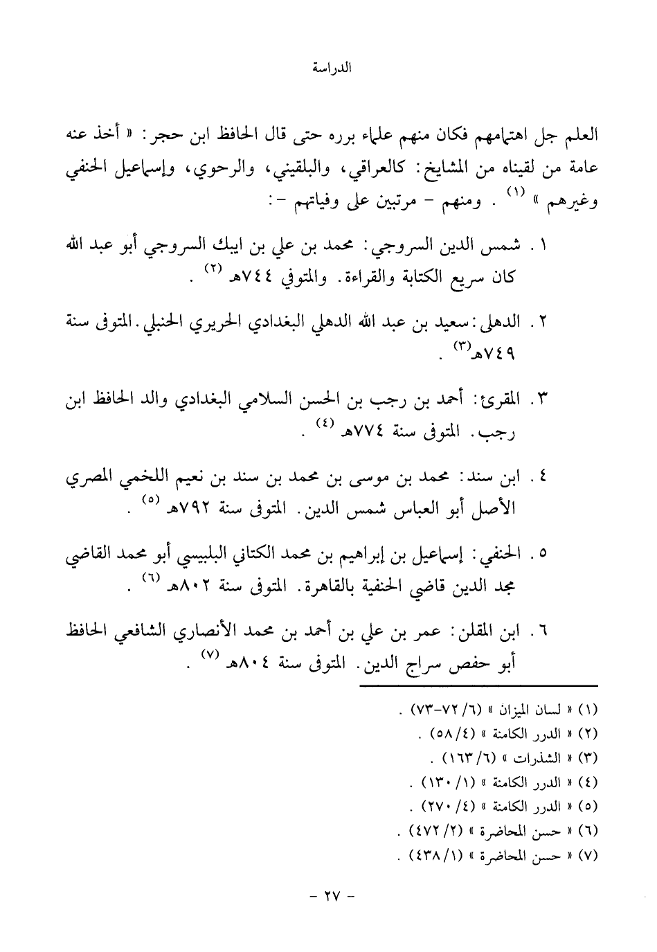 ٦. ابن المقلن: عمر بن علي بن أحمد بن محمد الأنصاري الشافعي الحافظ أبو حفص سراج الدين. المتوفى سنة ٨٠٤ هـ (¬٧).
