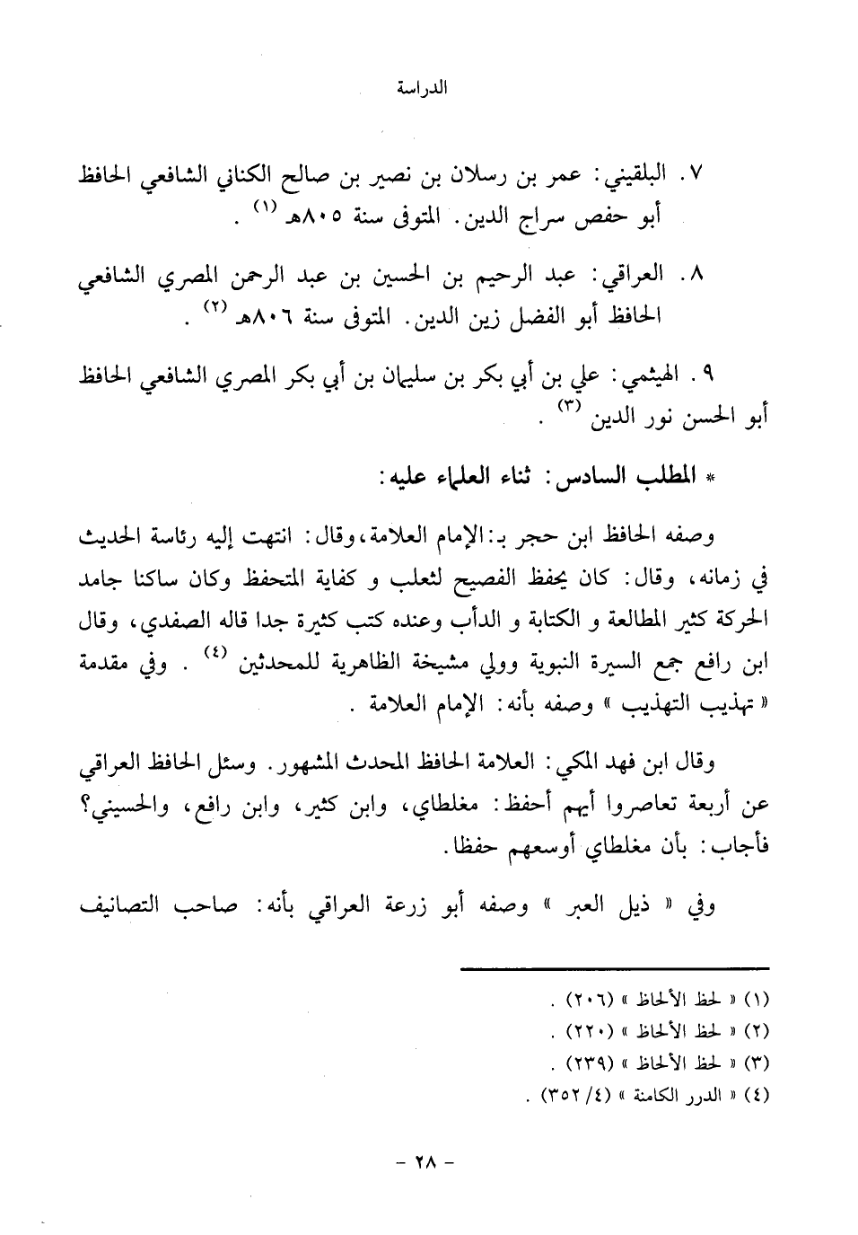 ٨. العراقي: عبد الرحيم بن الحسين بن عبد الرحمن المصري الشافعي الحافظ أبو الفضل زين الدين. المتوفى سنة ٨٠٦ هـ (¬٢).