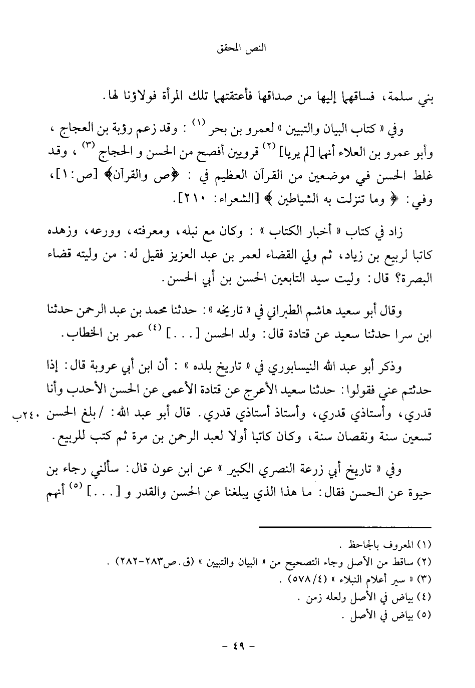 وفي "كتاب البيان والتبيين" لعمرو بن بحر (¬١): وقد زعم رؤبة بن العجاج، وأبو عمرو بن العلاء أنهما [لم يريا] (¬٢) قرويين أفصح من الحسن والحجاج (¬٣)، وقد غلط الحسن في موضعين من القرآن العظيم في: (ص والقرآن) [ص: ١]، وفي: {وَمَا تَنَزَّلَتْ بِهِ الشَّيَاطِينُ} [الشعراء: ٢١٠]
