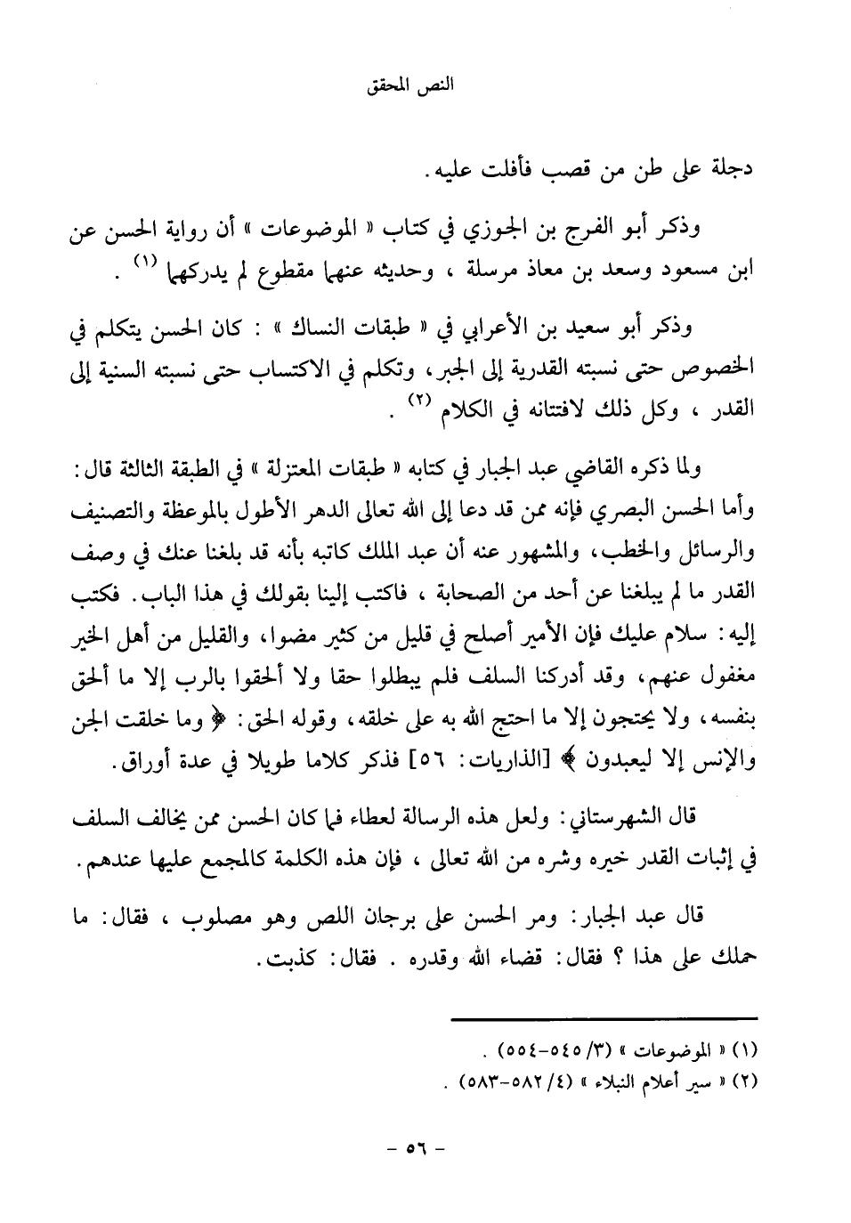 ولما ذكره القاضي عبد الجبار في كتابه "طبقات المعتزلة" في الطبقة الثالثة قال: وأما الحسن البصري فإنه ممن قد دعا إلى الله تعالى الدهر الأطول بالموعظة والتصنيف والرسائل والخطب، والمشهور عنه أن عبد الملك كاتبه بأنه قد بلغنا عنك في وصف القدر ما لم يبلغنا عن أحد من الصحابة، فاكتب إلينا بقولك في هذا الباب. فكتب إليه: سلام عليك فإن الأمير أصلح في قليل من كثير مضوا، والقليل من أهل الخير مغفول عنهم، وقد أدركنا السلف فلم يبطلوا حقا ولا ألحقوا بالرب إلا ما ألحق بنفسه، ولا يحتجون إلا ما احتج الله به على خلقه، وقوله الحق: {وَمَا خَلَقْتُ الْجِنَّ وَالْإِنْسَ إِلَّا لِيَعْبُدُونِ} [الذاريات: ٥٦]، فذكر كلاما طويلا في عدة أوراق.