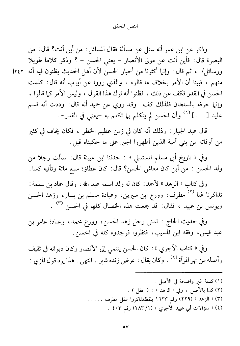 وذكر عن ابن عمر أنه سئل عن مسألة فقال للسائل: من أين أنت؟ قال: من البصرة قال: فأين أنت عن مولى الأنصار -يعني الحسن-؟ وذكر كلاما طويلا ورسائل، ثم قال: وإنما أكثرنا من أخبار الحسن لأن أهل الحديث يظنون فيه أنه منهم، فبينا أن الأمر بخلاف ما قالوه، والذي رووا عن أيوب أنه قال: كلمت الحسن في القدر فكف عن ذلك، فظنوا أنه ترك هذا القول، وليس الأمر كما قالوا، وإنما خوفه بالسلطان فلذلك كف. وقد روي عن حميد أنه قال: وددت أنه قسم علينا [ ... ] (¬١) وأن الحسن لم يتكلم بما تكلم به -يعني في القدر-.