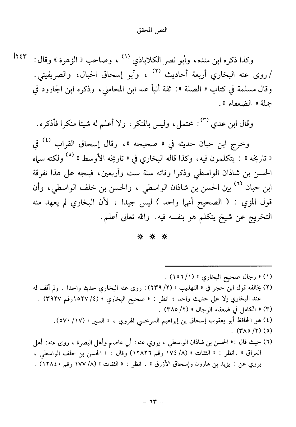 وخرج ابن حبان حديثه في "صحيحه"، وقال إسحاق القراب (¬٤) في "تاريخه": يتكلمون فيه، وكذا قاله البخاري في "تاريخه الأوسط" (¬٥) ولكنه سماه الحسن بن شاذان الواسطي وذكرا وفاته سنة ست وأربعين، فيتجه على هذا تفرقة ابن حبان (¬٦) بين الحسن بن شاذان الواسطى، والحسن بن خلف الواسطي، وأن قول المزي: (الصحيح أنهما واحد) ليس جيدا، لأن البخاري لم يعهد منه التخريج عن شيخ يتكلم هو بنفسه فيه. والله تعالى أعلم.