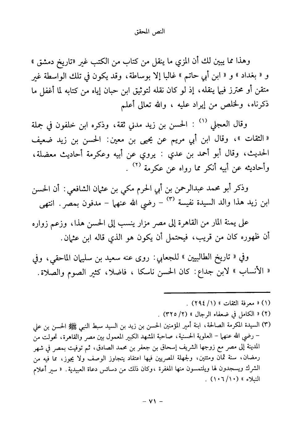 (¬٣) السيدة المكرمة الصالحة، ابنة أمير المؤمنين الحسن بن زيد بن السيد سبط النبي - صَلَّى اللهُ عَلَيْهِ وَسَلَّمَ - الحسن بن علي - رضي الله عنهما- العلوية الحسنية، صاحبة المشهد الكبير المعمول بين مصر والقاهرة، تحولت من المدينة إلى مصر مع زوجها الشريف إسحاق بن جعفر بن محمد الصادق، ثم توفيت بمصر في شهر رمضان، سنة ثمان ومئتين، ولجهلة المصريين فيها اعتقاد يتجاوز الوصف ولا يجوز، مما فيه من الشرك ويسجدون لها ويلتمسون منها المغفرة، وكان ذلك من دسائس دعاة العبيدية. "سير أعلام النبلاء" (١٠/ ١٠٦).