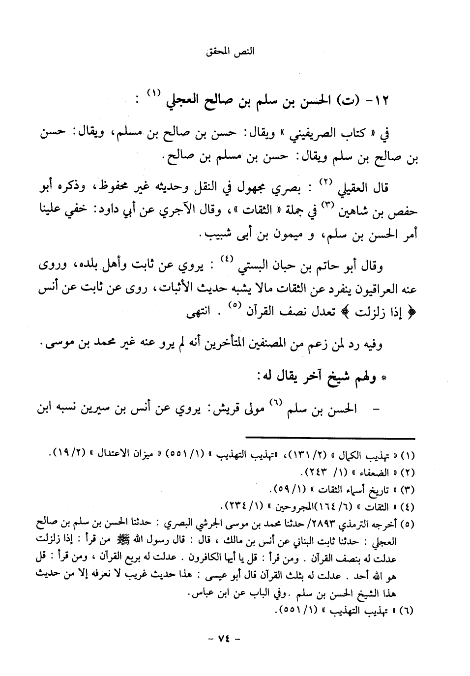 (¬٥) أخرجه الترمذي ٢٨٩٣/ حدثنا محمد بن موسى الجرشي البصري: حدثنا الحسن بن سلم بن صالح العجلي: حدثنا ثابت البناني عن أنس بن مالك، قال: قال رسول الله - صَلَّى اللهُ عَلَيْهِ وَسَلَّمَ - من قرأ: إذا زلزلت عدلت له بنصف القرآن. ومن قرأ: قل يا أيها الكافرون. عدلت له بربع القرآن، ومن قرأ: قل هو الله أحد. عدلت له بثلث القرآن قال أبو عيسى: هذا حديث غريب لا نعرفه إلا من حديث هذا الشيخ الحسن بن سلم. وفي الباب عن ابن عباس.