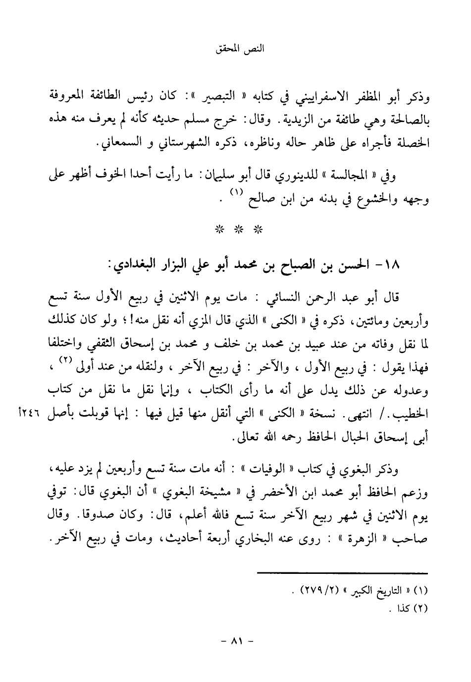 قال أبو عبد الرحمن النسائي: مات يوم الاثنين في ربيع الأول سنة تسع وأربعين ومائتين، ذكره في "الكنى" الذي قال المزي أنه نقل منه! ، ولو كان كذلك لما نقل وفاته من عند عبيد بن محمد بن خلف ومحمد بن إسحاق الثقفي واختلفا فهذا يقول: في ربيع الأول، والآخر في ربيع الآخر، ولنقله من عند أولى (¬٢)، وعدوله عن ذلك يدل على أنه ما رأى الكتاب، وإنما نقل ما نقل من كتاب الخطيب. انتهى. نسخة "الكنى" التي أنقل منها قيل فيها: إنها قوبلت بأصل أبى إسحاق الحبال الحافظ رحمه الله تعالى.