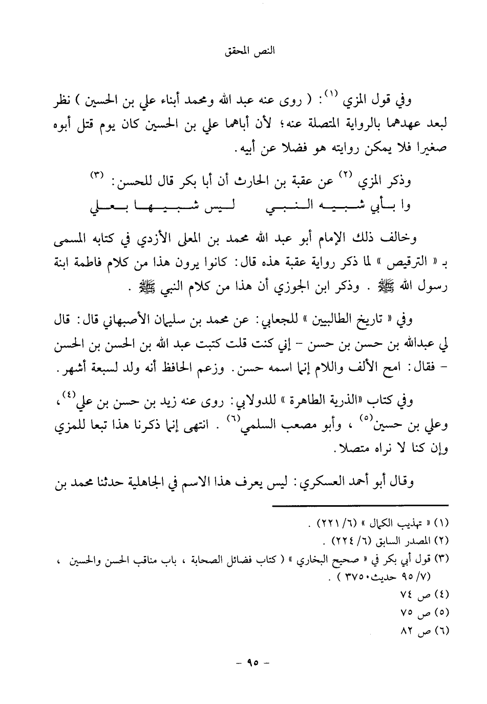 وفي قول المزي (¬١): (روى عنه عبد الله ومحمد أبناء علي بن الحسين) نظر لبعد عهدهما بالرواية المتصلة عنه، لأن أباهما علي بن الحسين كان يوم قتل أبوه صغيرا فلا يمكن روايته هو فضلا عن أبيه.
