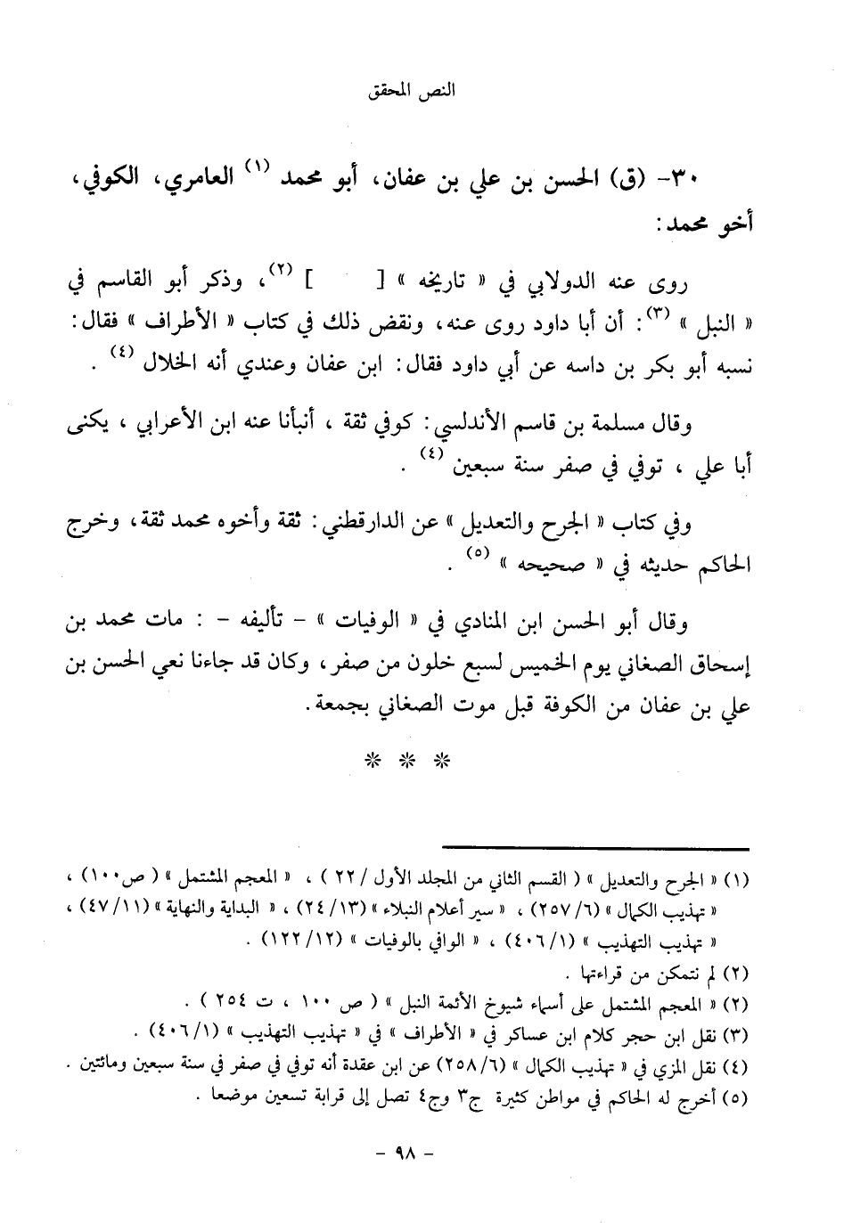 (¬٥) نقل المزي في "تهذيب الكمال" (٦/ ٢٥٨) عن ابن عقدة أنه توفي في صفر في سنة سبعين ومائتين.