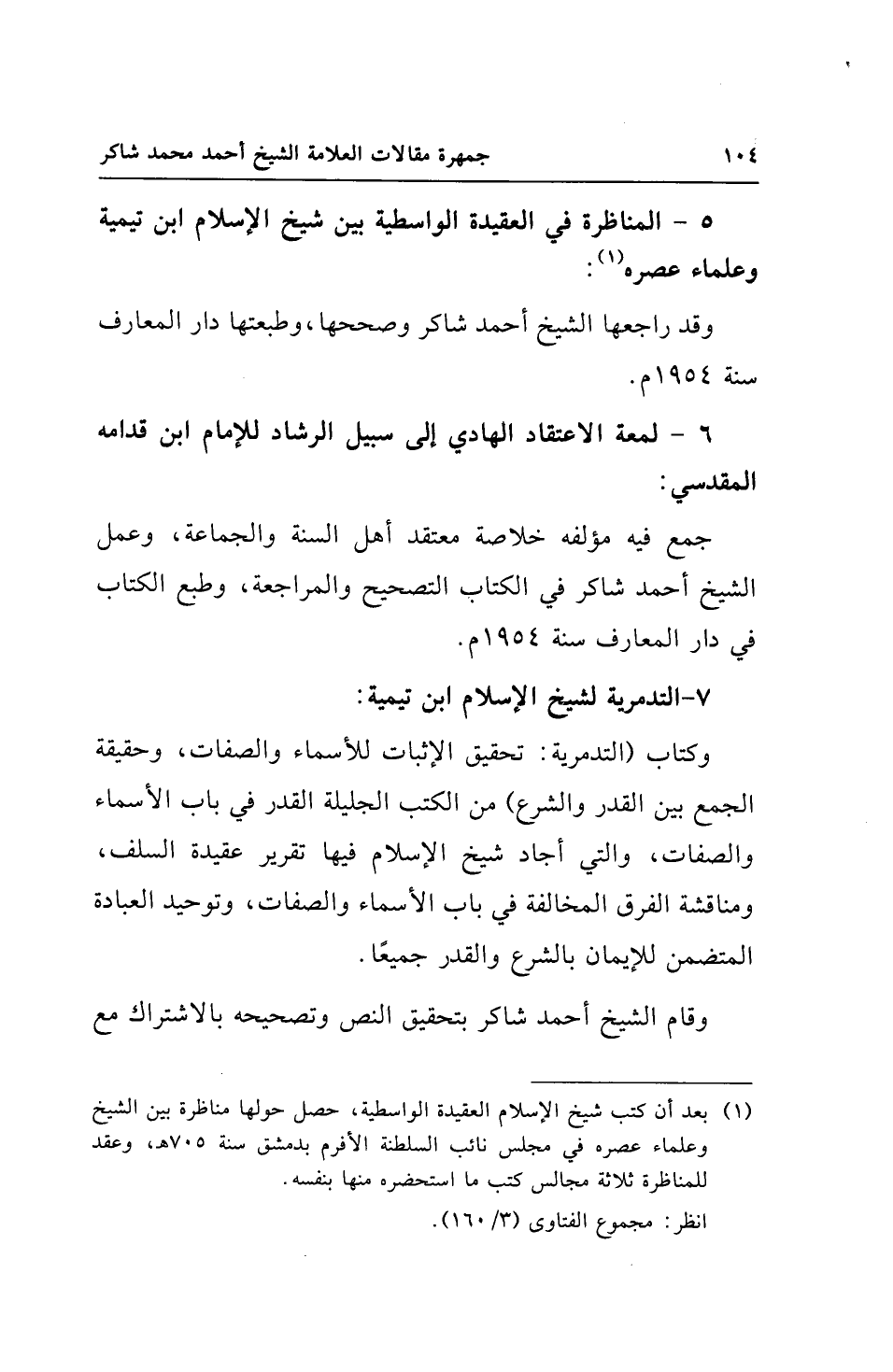 (¬1) بعد أن كتب شيخ الإِسلام العقيدة الواسطية، حصل حولها مناظرة بين الشيخ وعلماء عصره في مجلس نائب السلطنة الأفرم بدمشق سنة 705 هـ، وعقد للمناظرة ثلاثة مجالس كتب ما استحضره منها بنفسه.