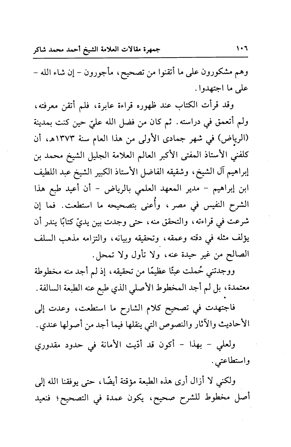 وقد قرأت الكتاب عند ظهوره قراءة عابرة، فلم أتقن معرفته، ولم أتعمق في دراسته. ثم كان من فضل الله عليّ حين كنت بمدينة (الرياض) في شهر جمادى الأولى من هذا العام سنة 1373 هـ، أن كلفني الأستاذ المفتى الأكبر العالم العلامة الجليل الشيخ محمد بن إبراهيم آل الشيخ، وشقيقه الفاضل الأستاذ الكبير الشيخ عبد اللطيف ابن إبراهيم - مدير المعهد العلمي بالرياض - أن أعيد طبع هذا الشرح النفيس في مصر، وأُعنى بتصحيحه ما استطعت. فما إن شرعت في قراءته، والتحقق منه، حتى وجدت بين يديّ كتابًا يندر أن يؤلف مثله في دقته وعمقه، وتحقيقه وبيانه، والتزامه مذهب السلف الصالح من غير حيدة عنه، ولا تأول ولا تمحل.