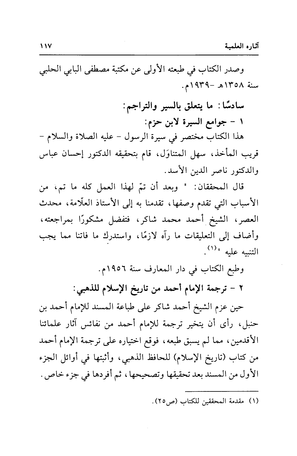 حين عزم الشيخ أحمد شاكر على طباعة المسند للإمام أحمد بن حنبل، رأى أن يتخير ترجمة للإمام أحمد من نفائس آثار علمائنا الأقدمين، مما لم يسبق طبعه، فوقع اختياره على ترجمة الإمام أحمد من كتاب (تاريخ الإِسلام) للحافظ الذهبي، وأثبتها في أوائل الجزء الأول من المسند بعد تحقيقها وتصحيحها، ثم أفردها في جزء خاص.