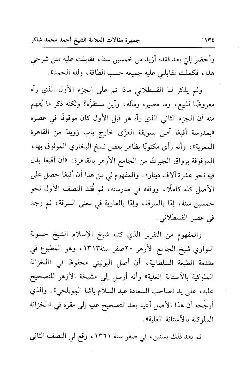 ولم يذكر لنا القسطلاني ماذا تم على الجزء الأول الذي رآه معروضًا للبيع، وما مصيره ومآله، وأين مستقرُّه؟ ولكنه ذكر ما يُفهم منه أن الجزء الثاني الذي رآه هو قبل الأول كان موقوفًا في عصره "بمدرسة أقبغا آص بسويقة العزّى خارج باب زويلة من القاهرة المعزية"، وأنه رأى مكتوبًا بظاهر بعض نسخ البخاري الموثوق بها، الموقوفة برواق الجبرتَ من الجامع الأزهر بالقاهرة: "أن أقبغا بذل فيه نحو عشرة آلاف دينار". والمفهوم لي من هذا أن أقبغا حصل على الأصل كله كاملًا، ووقفه في مدرسته، ثم فُقد النصف الأول نحو خمسين سنة، إمّا بالسرقة، وإمّا بالعارية في معنى السرقة، ثم وجد في عصر القسطلاني.