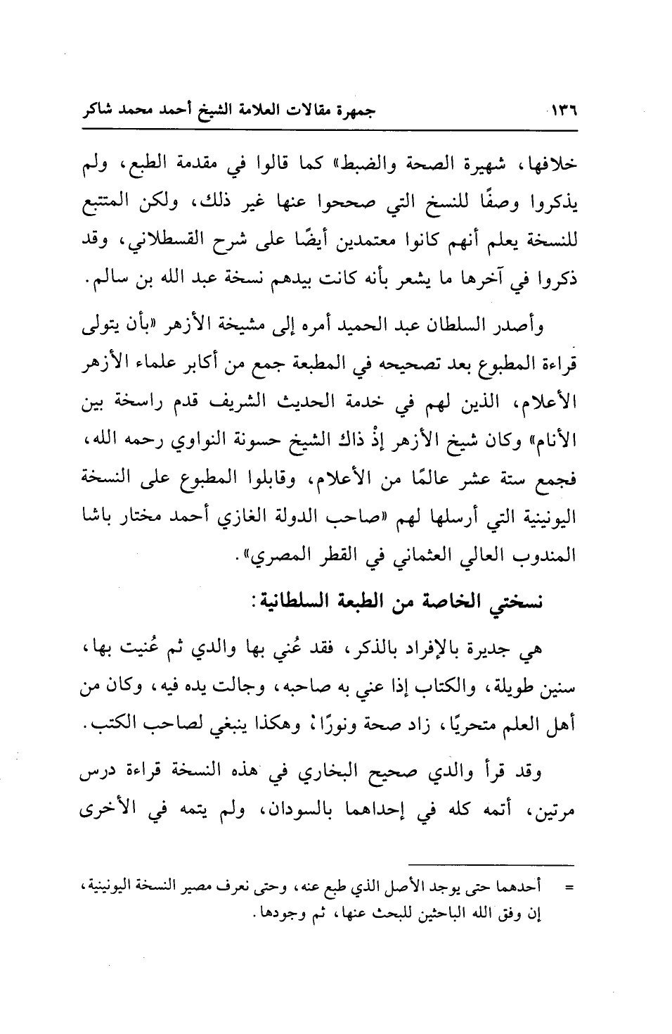 وأصدر السلطان عبد الحميد أمره إلى مشيخة الأزهر "بأن يتولى قراءة المطبوع بعد تصحيحه في المطبعة جمع من أكابر علماء الأزهر الأعلام، الذين لهم في خدمة الحديث الشريف قدم راسخة بين الأنام" وكان شيخ الأزهر إذْ ذاك الشيخ حسونة النواوي رحمه الله، فجمع ستة عشر عالمًا من الأعلام، وقابلوا المطبوع على النسخة اليونينية التي أرسلها لهم "صاحب الدولة المغازي أحمد مختار باشا المندوب العالي العثماني في القطر المصري".