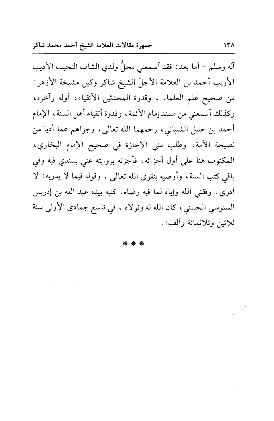 آله وسلم - أما بعد: فقد أسمعني محلُّ ولدي الشاب النجيب الأديب الأريب أحمد بن العلامة الأجلّ الشيخ شاكر وكيل مشيخة الأزهر: من صحيح علم العلماء، وقدوة المحدثين الأتقياء، أوله وآخره، وكذلك أسمعني من مسند إمام الأئمة، وقدوة أتقياء أهل السنة، الإمام أحمد بن حنبل الشيباني، رحمهما الله تعالى، وجزاهم عما أديا من نصيحة الأمة، وطلب مني الإجازة في صحيح الإمام البخاري، المكتوب هنا على أول أجزائه، فأجزته بروايته عني بسندي فيه وفي باقي كتب السنة، وأوصيه بتقوى الله تعالى، وقوله فيما لا يدريه: لا أدري. وفقني الله وإياه لما فيه رضاه. كتبه بيده عبد الله بن إدريس السنوسي الحسني، كان الله له وتولاه، في تاسع جمادى الأولى سنة ثلاثين وثلاثمائة وألف".