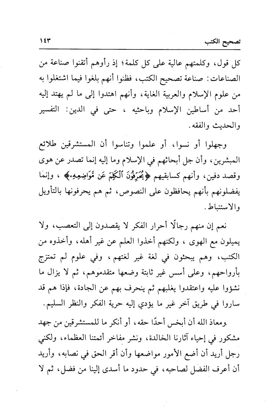 ومعاذ الله أن أبخس أحدًا حقه، أو أنكر ما للمستشرقين من جهد مشكور في إحياء آثارنا الخالدة، ونشر مفاخر أئمتنا العظماء، ولكني رجل أريد أن أضع الأمور مواضعها وأن أقر الحق في نصابه، وأريد أن أعرف الفضل لصاحبه، في حدود ما أسدى إلينا من فضل، ثم لا