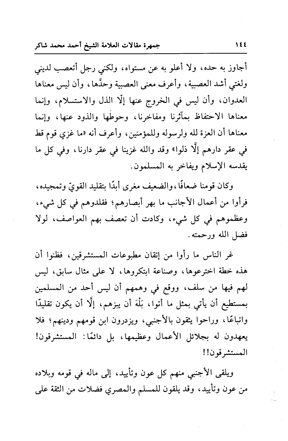 أجاوز به حده، ولا أعلو به عن مستواه، ولكني رجل أتعصب لديني ولغتي أشد العصبية، وأعرف معنى العصبية وحدَّها، وأن ليس معناها العدوان، وأن ليس في الخروج عنها إلّا الذل والاستسلام، وإنما معناها الاحتفاظ بمآثرنا ومفاخرنا، وحوطها والذود عنها، وإنما معناها أن العزة لله ولرسوله وللمؤمنين، وأعرف أنه "ما غزي قوم قط في عقر دارهم إلَّا ذلوا" وقد والله غزينا في عقر دارنا، وفي كل ما يقدسه الإسلام ويفاخر به المسلمون.