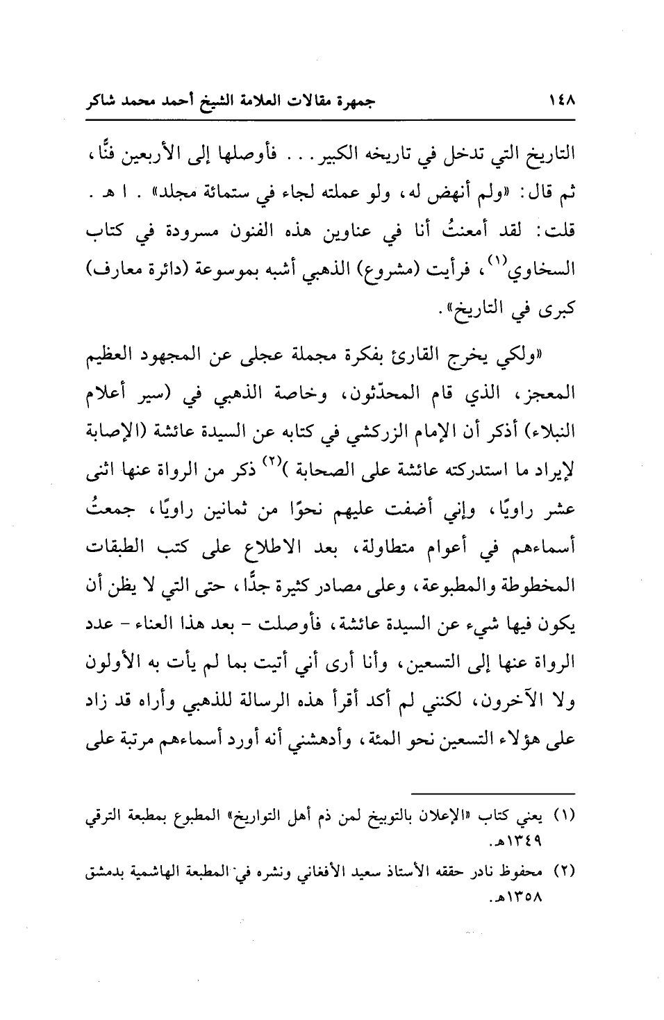 "ولكي يخرج القارئ بفكرة مجملة عجلى عن المجهود العظيم المعجز، الذي قام المحدّثون، وخاصة الذهبي في (سير أعلام النبلاء) أذكر أن الإمام الزركشي في كتابه عن السيدة عائشة (الإصابة لإيراد ما استدركته عائشة على الصحابة) (¬2) ذكر من الرواة عنها اثنى عشر راويًا، وإني أضفت عليهم نحوًا من ثمانين راويًا، جمعتُ أسماءهم في أعوام متطاولة، بعد الاطلاع على كتب الطبقات المخطوطة والمطبوعة، وعلى مصادر كثيرة جدًّا، حتى التي لا يظن أن يكون فيها شيء عن السيدة عائشة، فأوصلت - بعد هذا العناء - عدد الرواة عنها إلى التسعين، وأنا أرى أني أتيت بما لم يأت به الأولون ولا الآخرون، لكنني لم أكد أقرأ هذه الرسالة للذهبي وأراه قد زاد على هؤلاء التسعين نحو المئة، وأدهشني أنه أورد أسماءهم مرتبة على