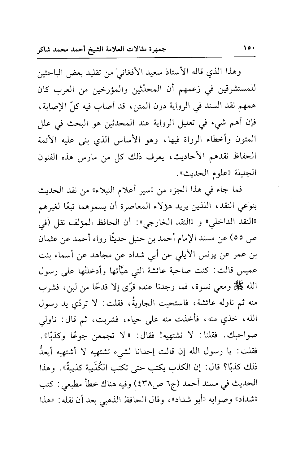 وهذا الذي قاله الأستاذ سعيد الأفغاني من تقليد بعض الباحثين للمستشرقين في زعمهم أن المحدّثين والمؤرخين من العرب كان همهم نقد السند في الرواية دون المتن، قد أصاب فيه كلّ الإصابة، فإن أهم شيء في تعليل الرواية عند المحدثين هو البحث في علل المتون وأخطاء الرواة فيها، وهو الأساس الذي بني عليه الأئمة الحفاظ نقدهم الأحاديث، يعرف ذلك كل من مارس هذه الفنون الجليلة "علوم الحديث".