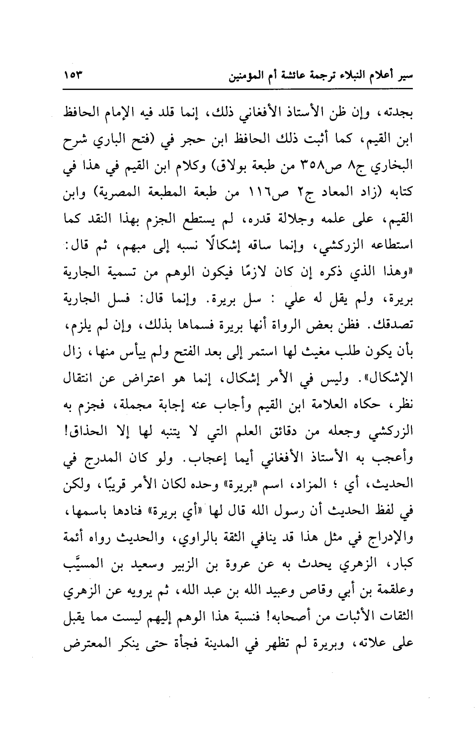 بجدته، وإن ظن الأستاذ الأفغاني ذلك، إنما قلد فيه الإمام الحافظ ابن القيم، كما أثبت ذلك الحافظ ابن حجر في (فتح الباري شرح البخاري ج 8 ص 358 من طبعة بولاق) وكلام ابن القيم في هذا في كتابه (زاد المعاد ج 2 ص 116 من طبعة المطبعة المصرية) وابن القيم، على علمه وجلالة قدره، لم يستطع الجزم بهذا النقد كما استطاعه الزركشي، وإنما ساقه إشكالًا نسبه إلى مبهم، ثم قال: "وهذا الذي ذكره إن كان لازمًا فيكون الوهم من تسمية الجارية بريرة، ولم يقل له علي: سل بريرة. وإنما قال: فسل الجارية تصدقك. فظن بعض الرواة أنها بريرة فسماها بذلك، وإن لم يلزم، بأن يكون طلب مغيث لها استمر إلى بعد الفتح ولم ييأس منها، زال الإشكال". وليس في الأمر إشكال، إنما هو اعتراض عن انتقال نظر، حكاه العلامة ابن القيم وأجاب عنه إجابة مجملة، فجزم به الزركشي وجعله من دقائق العلم التي لا يتنبه لها إلا الحذاق! وأعجب به الأستاذ الأفغاني أيما إعجاب. ولو كان المدرج في الحديث، أي؛ المزاد، اسم "بريرة" وحده لكان الأمر قريبًا، ولكن في لفظ الحديث أن رسول الله قال لها "أي بريرة" فنادها باسمها، والإدراج في مثل هذا قد ينافي الثقة بالراوي، والحديث رواه أئمة كبار، الزهري يحدث به عن عروة بن الزبير وسعيد بن المسيَّب وعلقمة بن أبي وقاص وعبيد الله بن عبد الله، ثم يرويه عن الزهري الثقات الأثبات من أصحابه! فنسبة هذا الوهم إليهم ليست مما يقبل على علاته، وبريرة لم تظهر في المدينة فجأة حتى ينكر المعترض