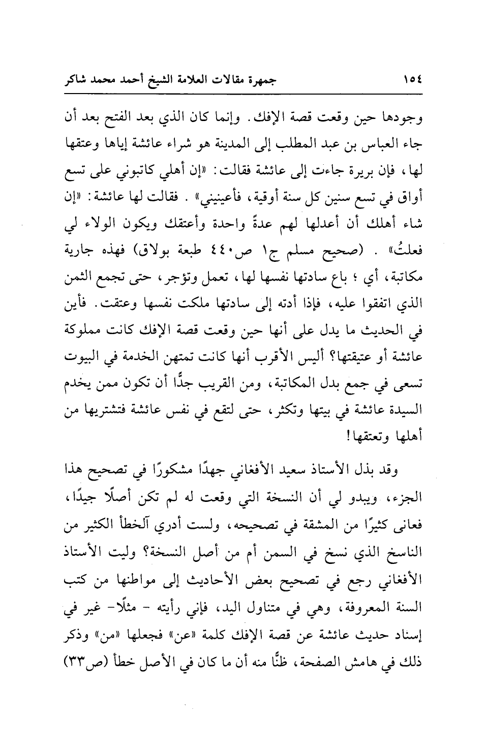 وجودها حين وقعت قصة الإفك. وإنما كان الذي بعد الفتح بعد أن جاء العباس بن عبد المطلب إلى المدينة هو شراء عائشة إياها وعتقها لها، فإن بريرة جاءت إلى عائشة فقالت: "إن أهلي كاتبوني على تسع أواق في تسع سنين كل سنة أوقية، فأعينيني". فقالت لها عائشة: "إن شاء أهلك أن أعدلها لهم عدةً واحدة وأعتقك ويكون الولاء لي فعلتُ". (صحيح مسلم ج 1 ص 440 طبعة بولاق) فهذه جارية مكاتبة، أي؛ باع سادتها نفسها لها، تعمل وتؤجر، حتى تجمع الثمن الذي اتفقوا عليه، فإذا أدته إلى سادتها ملكت نفسها وعتقت. فأين في الحديث ما يدل على أنها حين وقعت قصة الإفك كانت مملوكة عائشة أو عتيقتها؟ أليس الأقرب أنها كانت تمتهن الخدمة في البيوت تسعى في جمع بدل المكاتبة، ومن القريب جدًّا أن تكون ممن يخدم السيدة عائشة في بيتها وتكثر، حتى لتقع في نفس عائشة فتشتريها من أهلها وتعتقها!