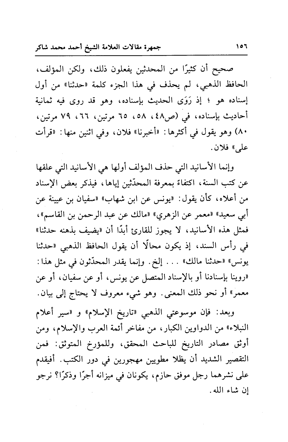 وبعد: فإن موسوعتي الذهبي "تاريخ الإسلام" و"سير أعلام النبلاء" من الدواوين الكبار، من مفاخر أئمة العرب والإسلام، ومن أوثق مصادر التاريخ للباحث المحقق، وللمؤرخ المتوثق: فمن التقصير الشديد أن يظلا مطويين مهجورين في دور الكتب. أفيقدم على نشرهما رجل موفق حازم، يكونان في ميزانه أجرًا وذكرًا؟ نرجو إن شاء الله.