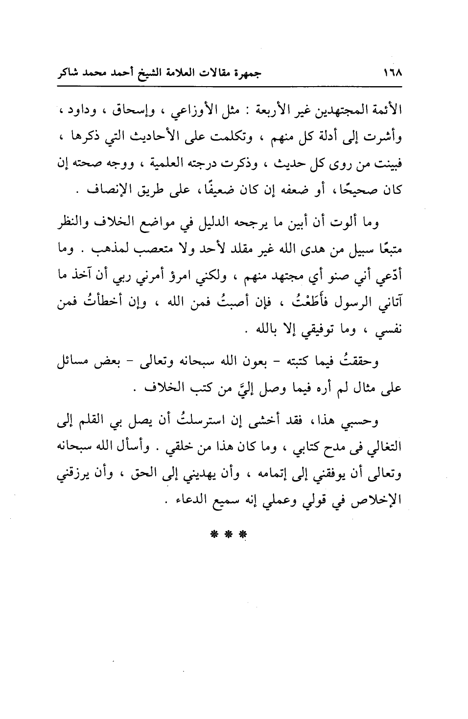 وما ألوت أن أبين ما يرجحه الدليل في مواضع الخلاف والنظر متبعًا سبيل من هدى الله غير مقلد لأحد ولا متعصب لمذهب. وما أدّعي أني صنو أي مجتهد منهم، ولكني امرؤ أمرني ربي أن آخذ ما آتاني الرسول فأَطَعْتُ، فإن أصبتُ فمن الله، وإن أخطأتُ فمن نفسي، وما توفيقي إلا بالله.