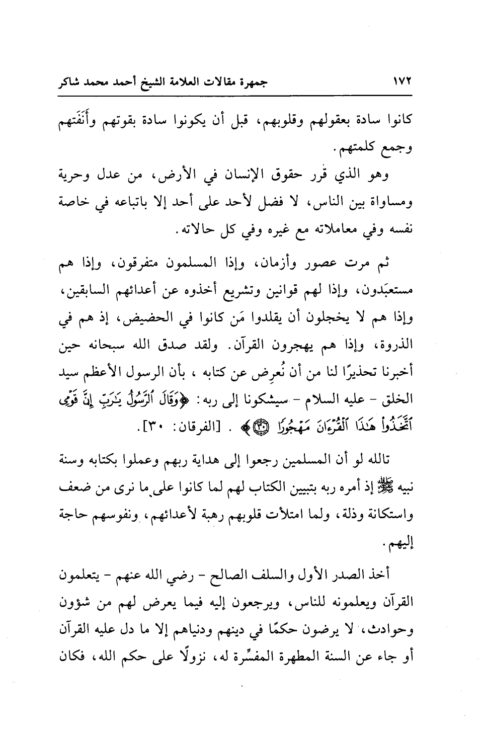 ثم مرت عصور وأزمان، وإذا المسلمون متفرقون، وإذا هم مستعبَدون، وإذا لهم قوانين وتشريع أخذوه عن أعدائهم السابقين، وإذا هم لا يخجلون أن يقلدوا مَن كانوا في الحضيض، إذ هم في الذروة، وإذا هم يهجرون القرآن. ولقد صدق الله سبحانه حين أخبرنا تحذيرًا لنا من أن نُعرِض عن كتابه، بأن الرسول الأعظم سيد الخلق - عليه السلام - سيشكونا إلى ربه: {وَقَالَ الرَّسُولُ يَارَبِّ إِنَّ قَوْمِي اتَّخَذُوا هَذَا الْقُرْآنَ مَهْجُورًا (30)}. [الفرقان: 30].