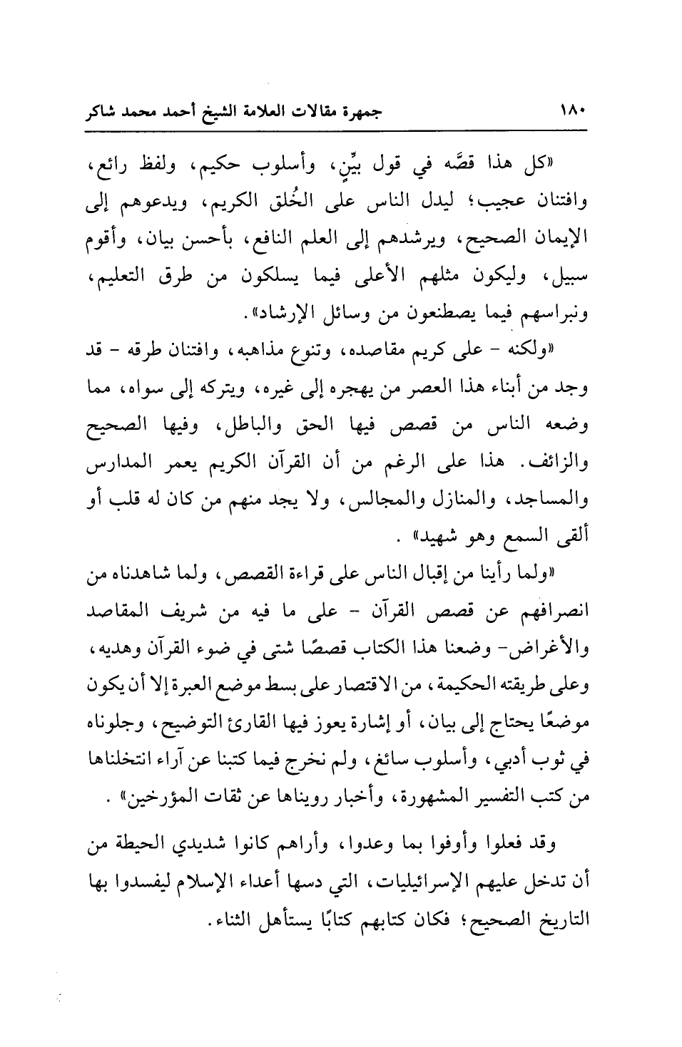 "ولكنه - على كريم مقاصده، وتنوع مذاهبه، وافتنان طرقه - قد وجد من أبناء هذا العصر من يهجره إلى غيره، ويتركه إلى سواه، مما وضعه الناس من قصص فيها الحق والباطل، وفيها الصحيح والزائف. هذا على الرغم من أن القرآن الكريم يعمر المدارس والمساجد، والمنازل والمجالس، ولا يجد منهم من كان له قلب أو ألقى السمع وهو شهيد".