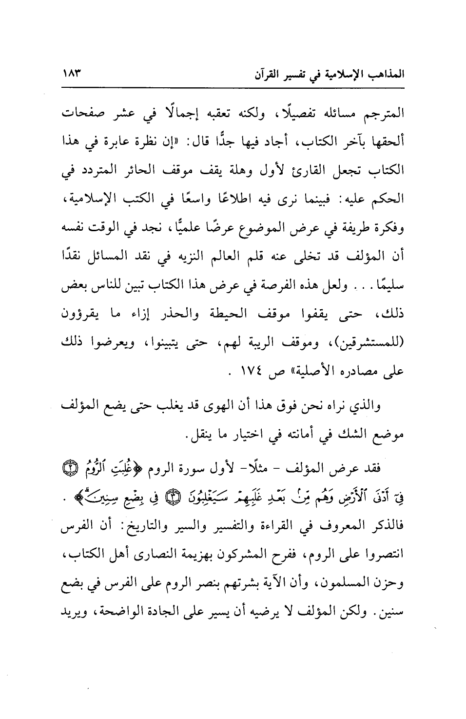 فقد عرض المؤلف - مثلًا - لأول سورة الروم {غُلِبَتِ الرُّومُ (2) فِي أَدْنَى الْأَرْضِ وَهُمْ مِنْ بَعْدِ غَلَبِهِمْ سَيَغْلِبُونَ (3) فِي بِضْعِ سِنِينَ}. فالذكر المعروف في القراءة والتفسير والسير والتاريخ: أن الفرس انتصروا على الروم، ففرح المشركون بهزيمة النصارى أهل الكتاب، وحزن المسلمون، وأن الآية بشرتهم بنصر الروم على الفرس في بضع سنين. ولكن المؤلف لا يرضيه أن يسير على الجادة الواضحة، ويريد