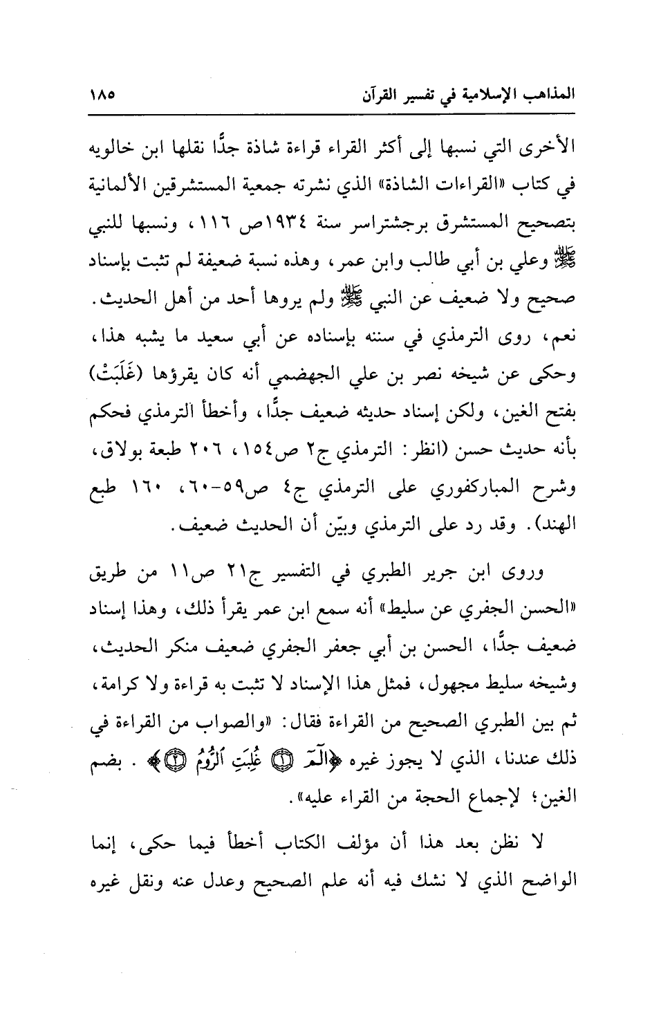 الأخرى التي نسبها إلى أكثر القراء قراءة شاذة جدًّا نقلها ابن خالويه في كتاب "القراءات الشاذة" الذي نشرته جمعية المستشرقين الألمانية بتصحيح المستشرق برجشتراسر سنة 1934 ص 116، ونسبها للنبي - صلى الله عليه وسلم - وعلي بن أبي طالب وابن عمر، وهذه نسبة ضعيفة لم تثبت بإسناد صحيح ولا ضعيف عن النبي - صلى الله عليه وسلم - ولم يروها أحد من أهل الحديث. نعم، روى الترمذي في سننه بإسناده عن أبي سعيد ما يشبه هذا، وحكى عن شيخه نصر بن علي الجهضمي أنه كان يقرؤها (غَلَبَتْ) بفتح الغين، ولكن إسناد حديثه ضعيف جدًّا، وأخطأ الترمذي فحكم بأنه حديث حسن (انظر: الترمذي ج 2 ص 154، 206 طبعة بولاق، وشرح المباركفوري على الترمذي ج 4 ص 59 - 60، 160 طبع الهند). وقد رد على الترمذي وبيّن أن الحديث ضعيف.