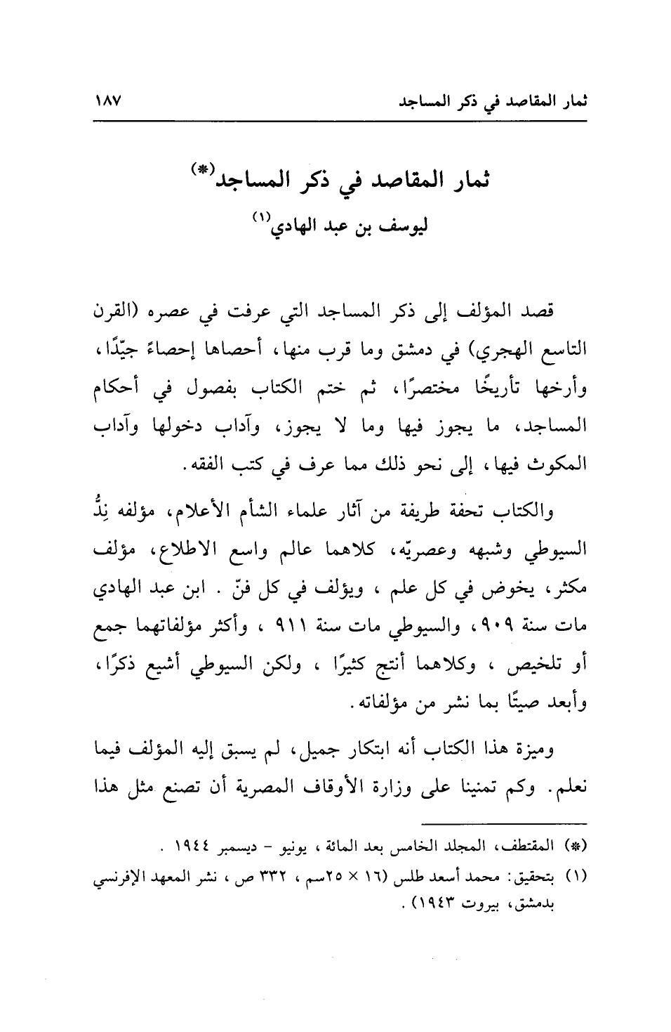ثمار المقاصد في ذكر المساجد (*) ليوسف بن عبد الهادي (¬1)